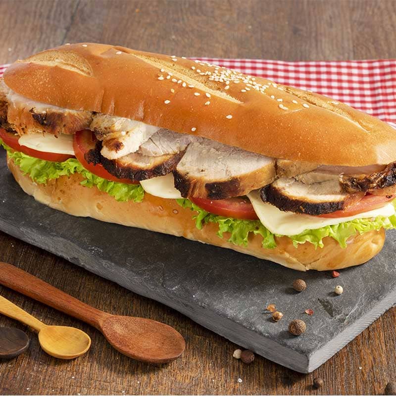 Un sabroso sandwich de pernil de cerdo con finas lonchas de carne, lechuga fresca, tomate y mayonesa en pan recién horneado.